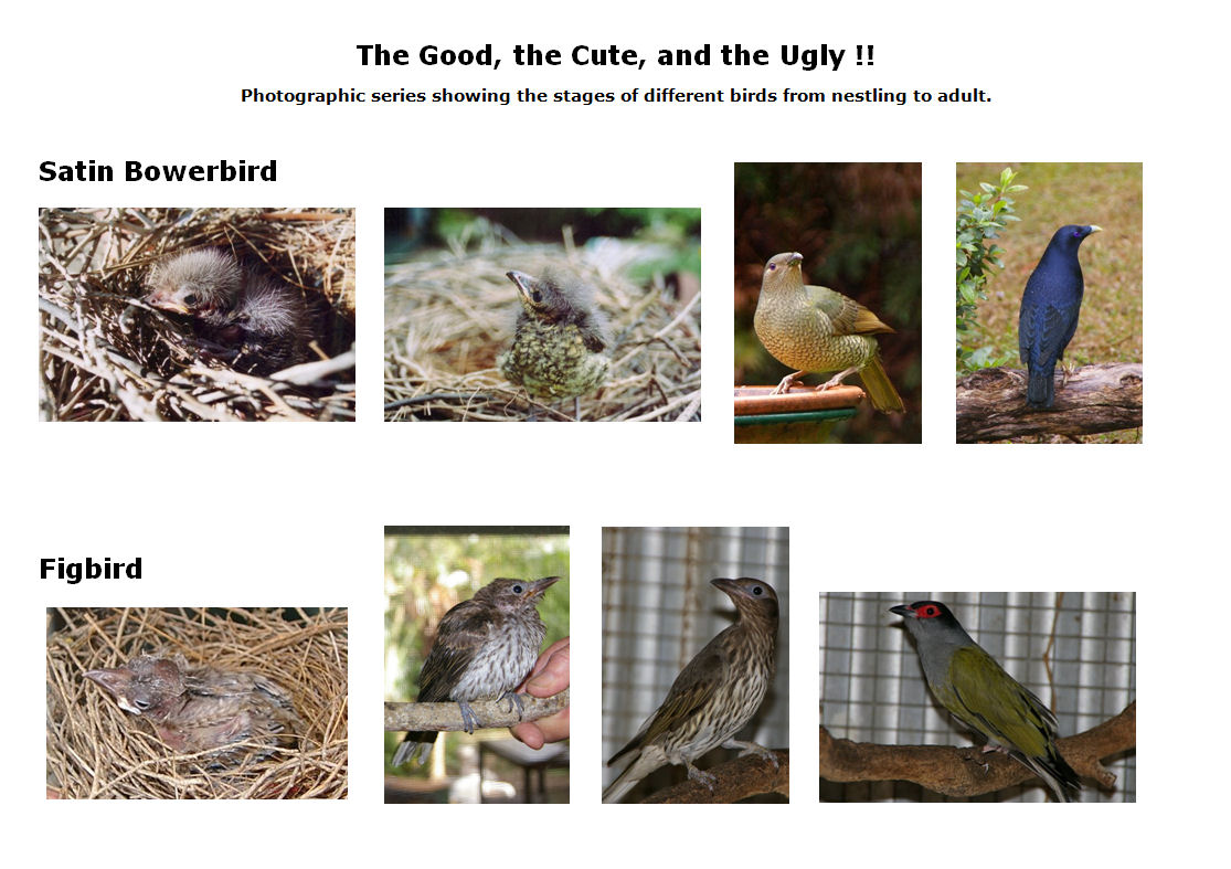 Photographic series showing the stages of different birds from nestling to adult.